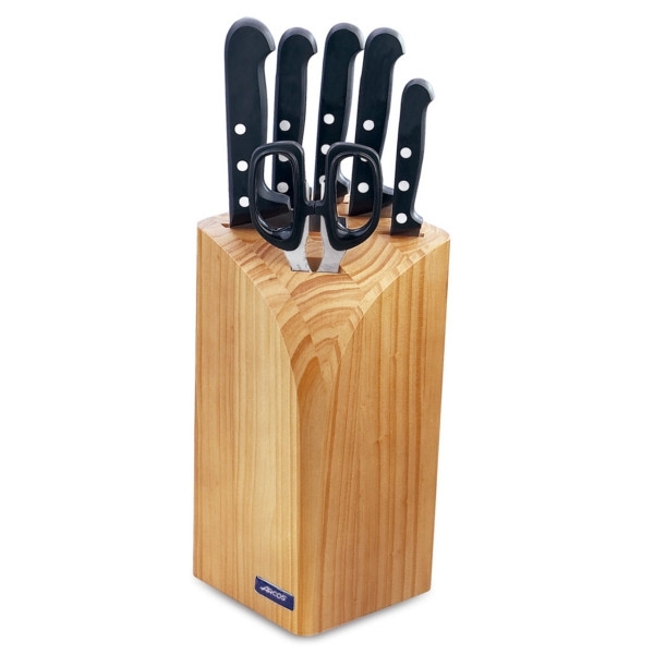 Jolis couteaux de cuisine très haute gamme Arcos, présentés dans un bloc en bois de rangement, composé d'un couteau de jambon flexible 24 cm, d'un couteau à pain 20 cm, d'un couteau à découper 17 cm, d'un couteau office 10 cm, d'un couteau feuille 16 cm et d'une paire de ciseaux de cuisine 20 cm.