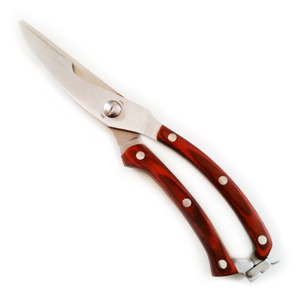 Ce sécateur à volaille est fabriqué avec 2 lames en acier inoxydable et son manche également. Ce dernier est recouvert de bois de coral de couleur marron-rouge foncé. Cet ustensile de cuisine est conçu pour découper sans forcer les petits os de volailles (poulet, pintade, canard, ...) et de petits gibiers.