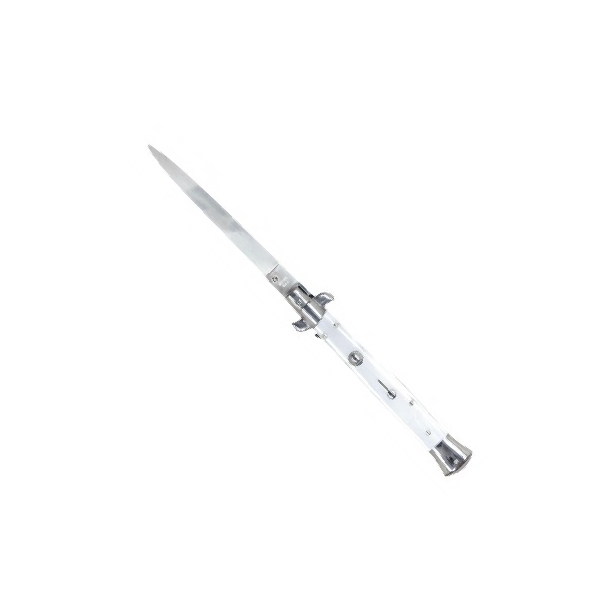 Ce couteau automatique à ouverture spontanée est doté d'un système de sûreté pour une sécurité optimale. Il est composé d'une lame totale de 12.5 cm, avec 11 cm d'utilité, elle est très fine et pointue et fabriquée en acier inoxydable 440. Son manche est d'une finition synthétique Nacré avec de jolis reflets façon perle.