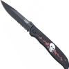 Couleurs: lame noire, manche noir ajouré rouge et décor tête de mort blanc.