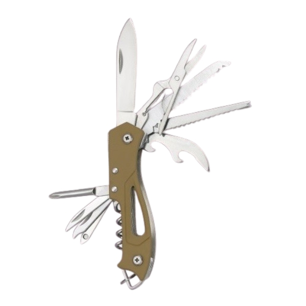 Couteau de poche multifonctions 10 outils avec manche soft kaki antidérapant. Compact, robuste, idéal pour camping, randonnée, pêche et bricolage.