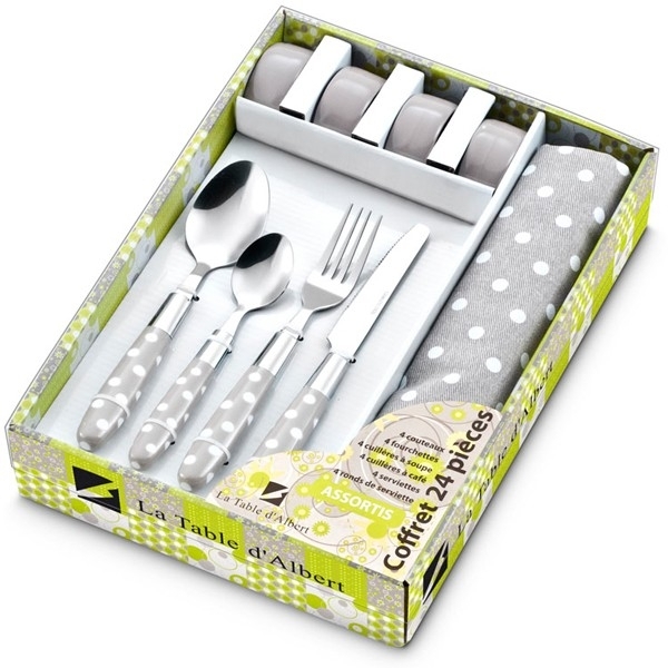 Pétillant, ces couverts, apporteront du pep's à votre décoration de table. Ce coffret de couverts, à manches poids blanc et taupe, serviettes et ronds de serviettes assortis est proposé à prix imbattable et vous apportera au quotidien tout le nécessaire pour un repas de 4 personnes.