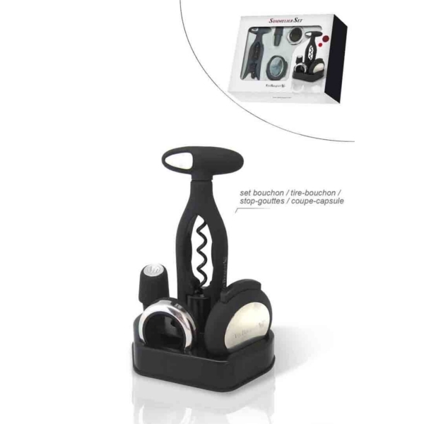 Ce magnifique coffret sommelier indispensable dans une cuisine est composé d'un bouchon, d'un tire-bouchon torsion, d'un coupe-capsule, d'un anneau stop-gouttes et d'un décapsuleur. Cet ensemble est fabriqué tout en métal, il est idéal pour l'ouverture sans aucune difficulté de vos bouteilles de vin.