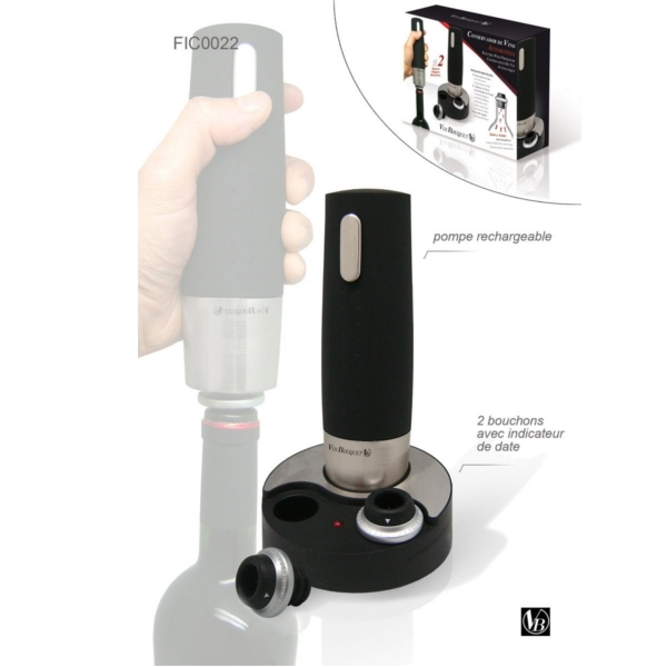 Livré avec 2 bouchons munis de bagues réglables permettant d'indiquer la date où la bouteille est mise en conservation. Pompe fonctionnant sur secteur. Produit vendu en coffret de 28x20 cm